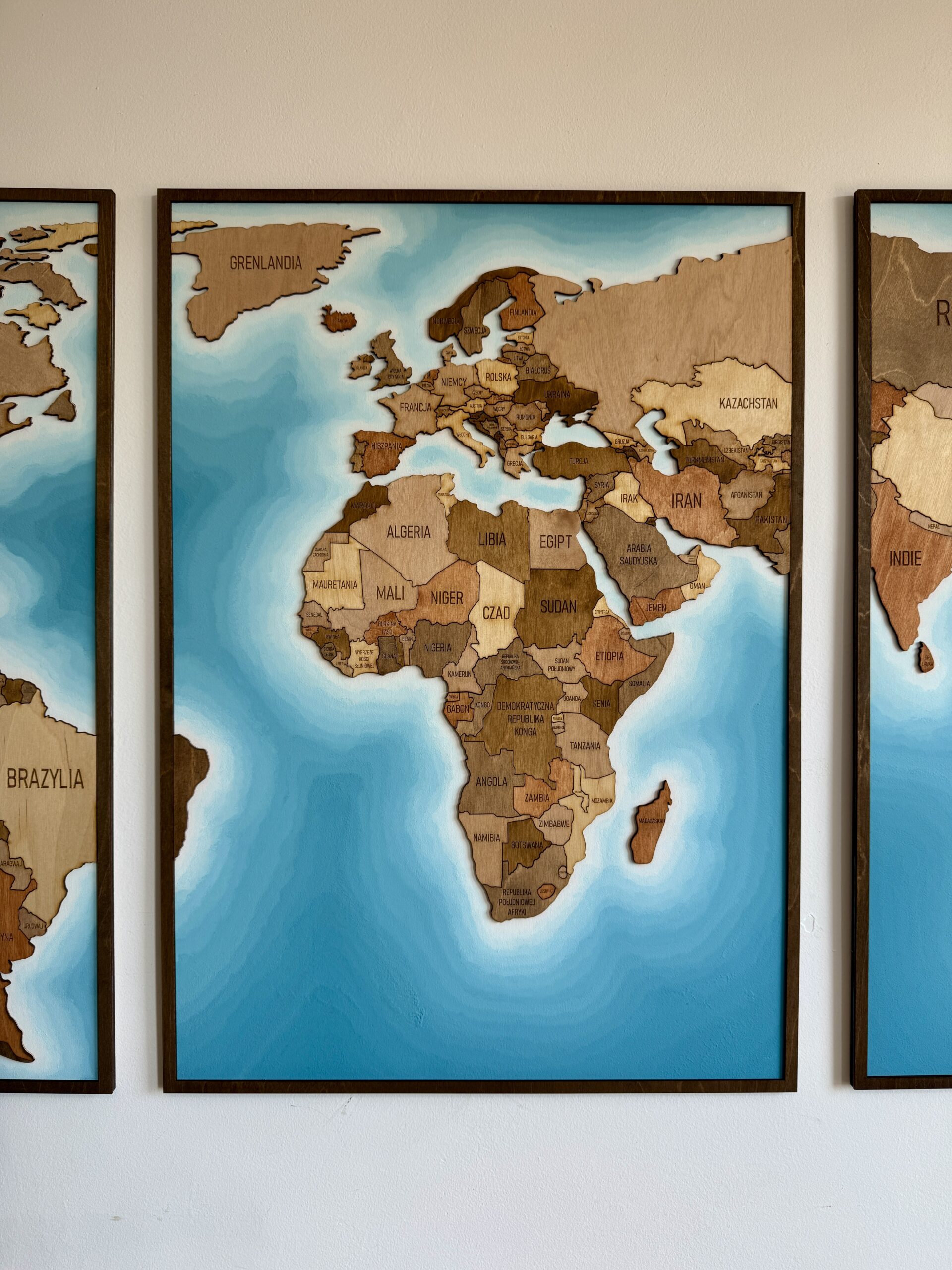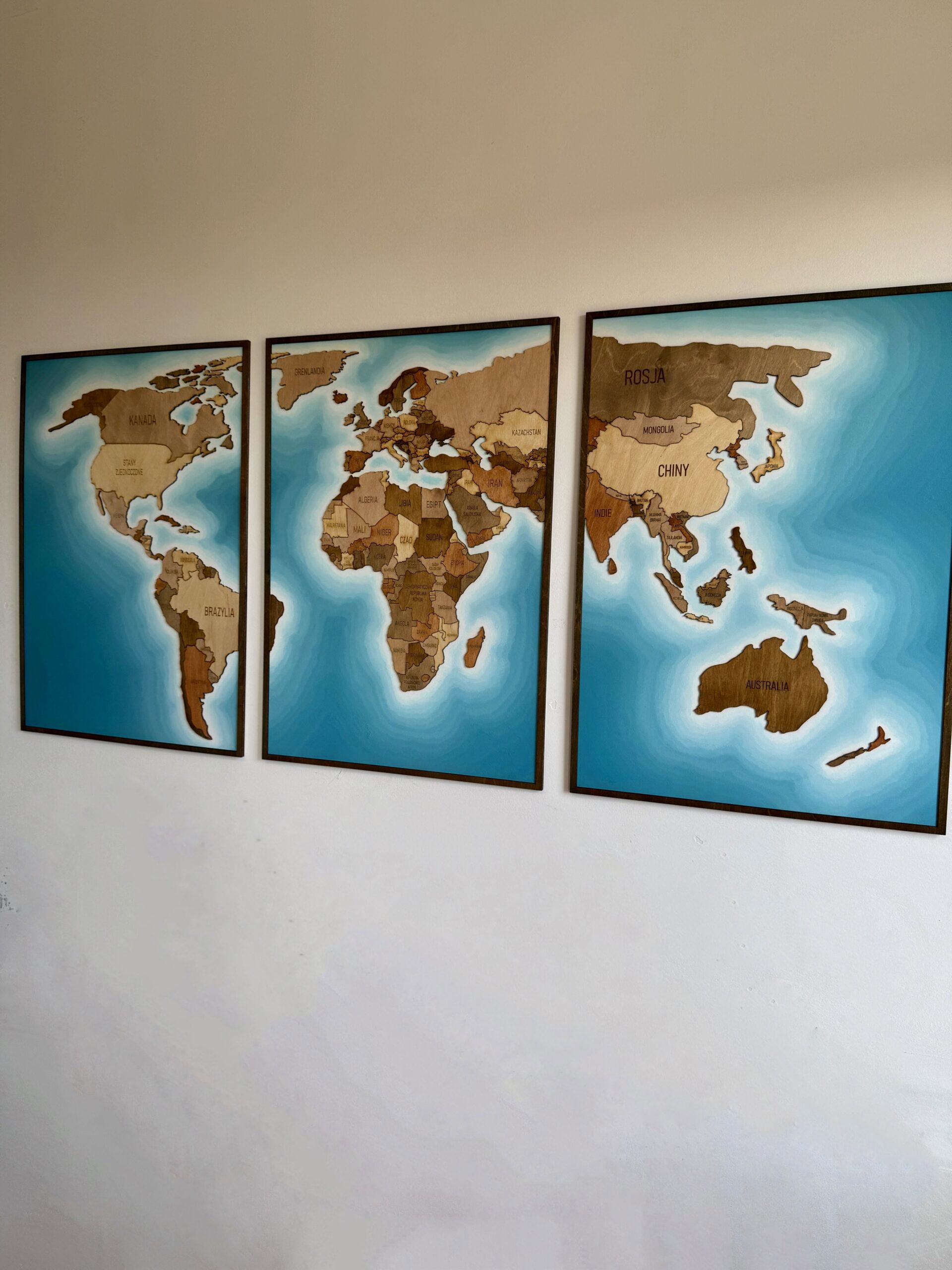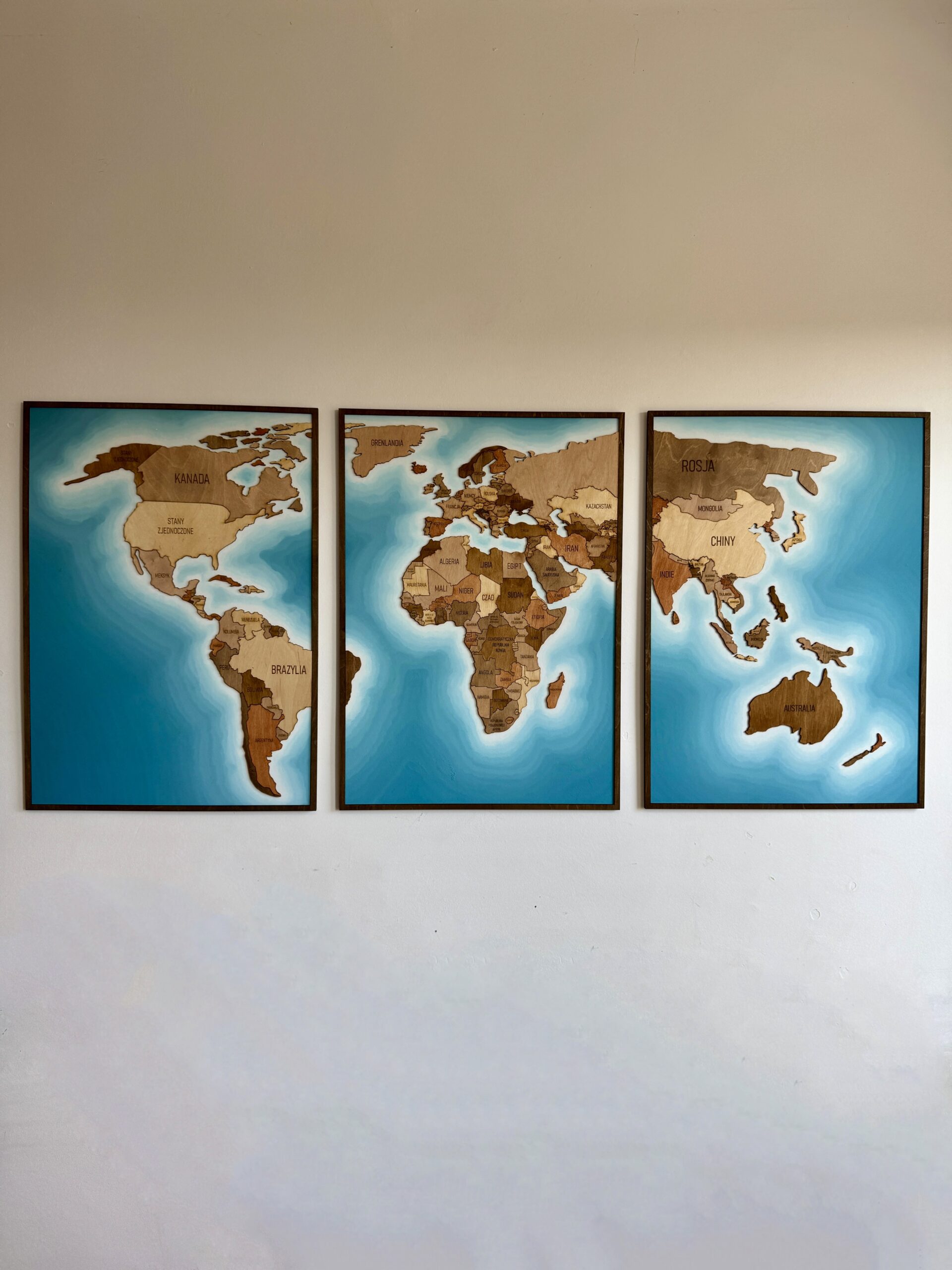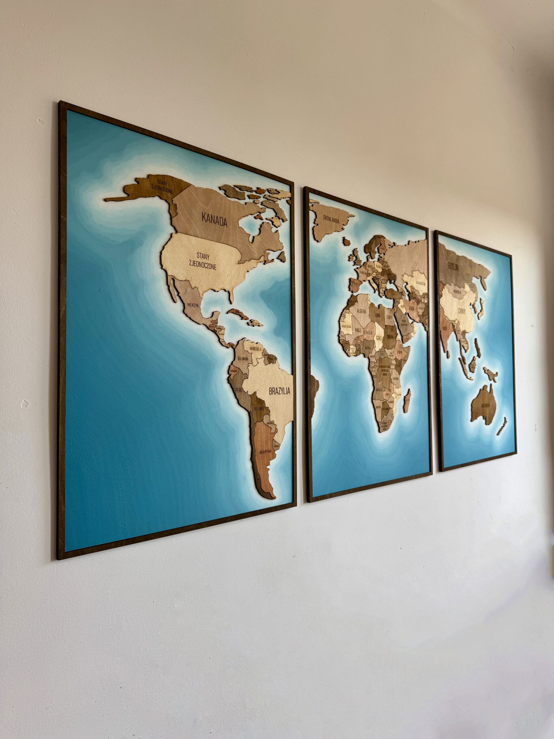 Mapa składa się z trzech paneli o wymiarach 50×70 cm, które razem tworzą efektowny tryptyk przedstawiający kontynenty i oceany w ciepłych, naturalnych barwach.