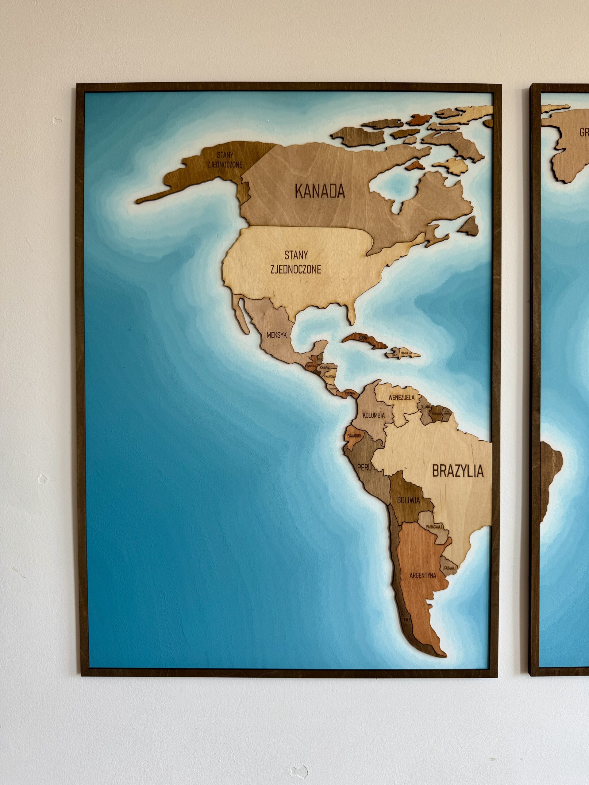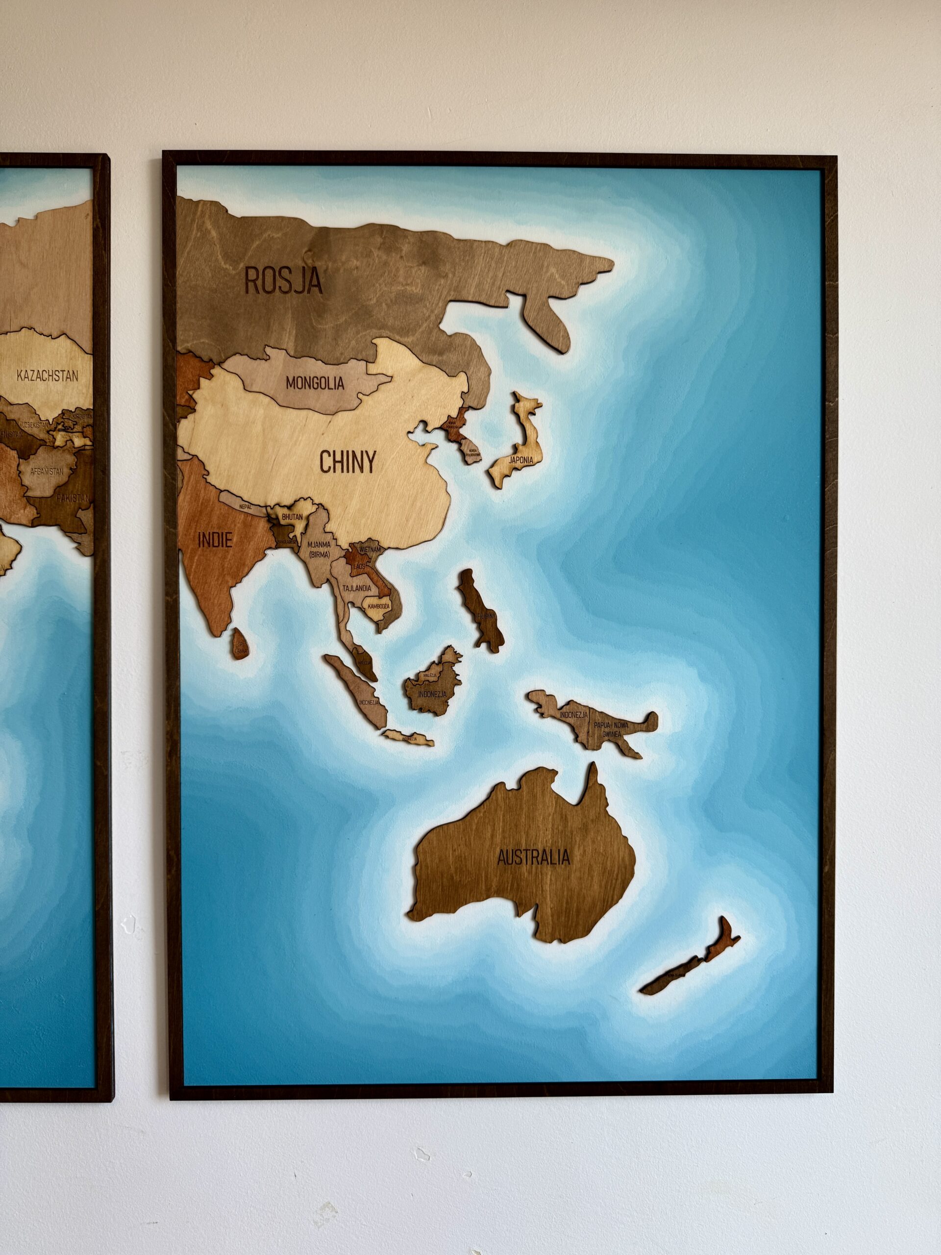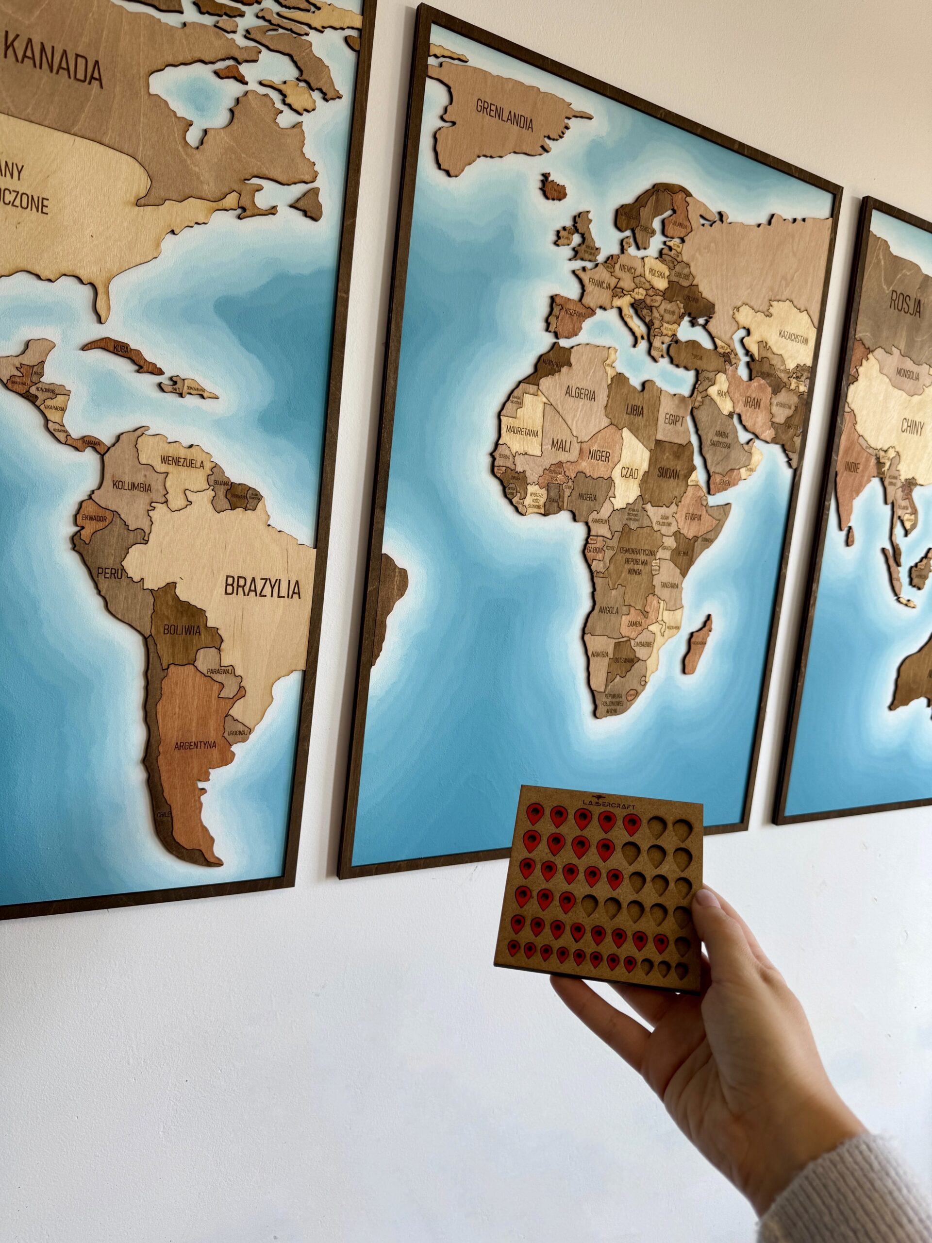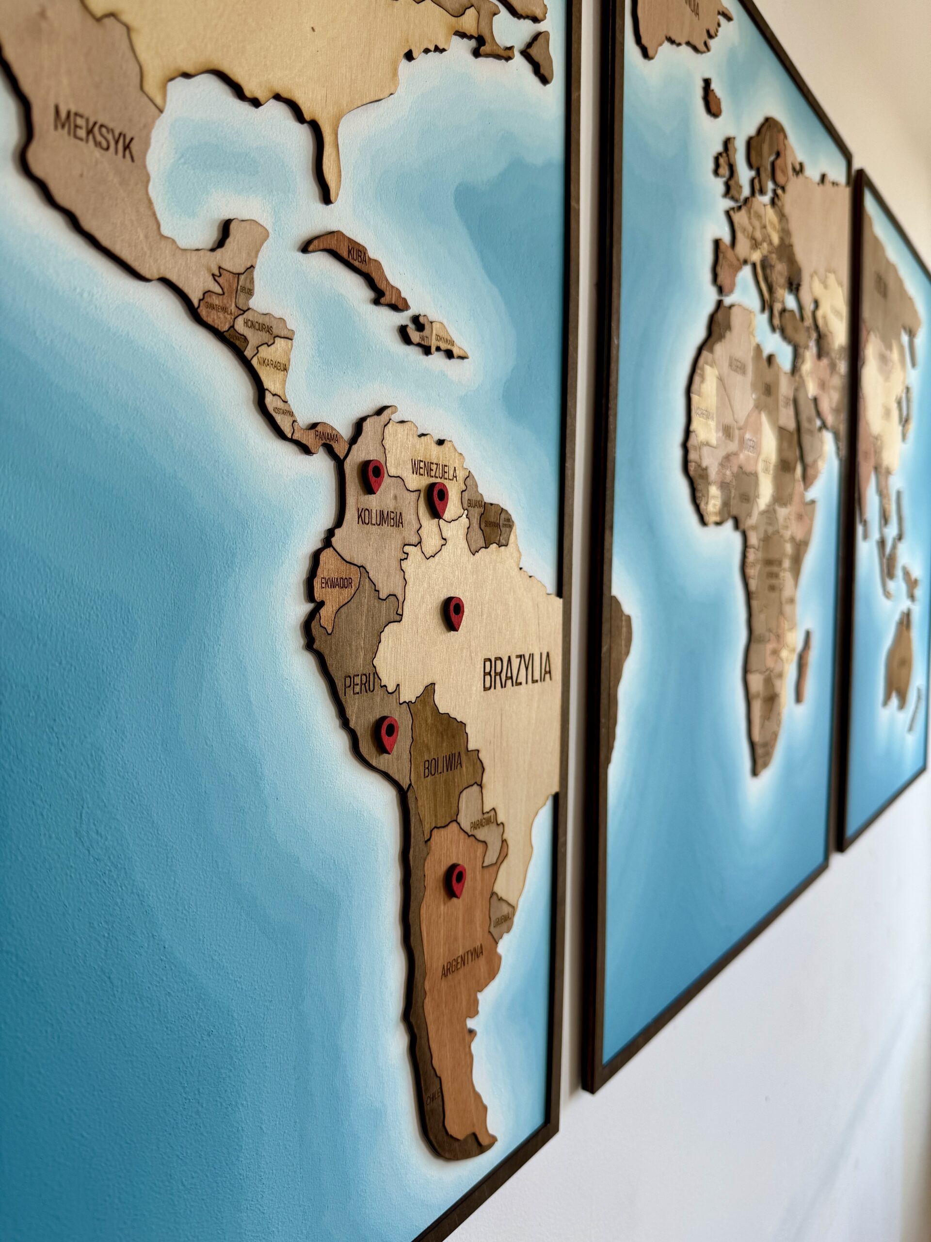 Mapa składa się z trzech paneli o wymiarach 50×70 cm, które razem tworzą efektowny tryptyk przedstawiający kontynenty i oceany w ciepłych, naturalnych barwach.