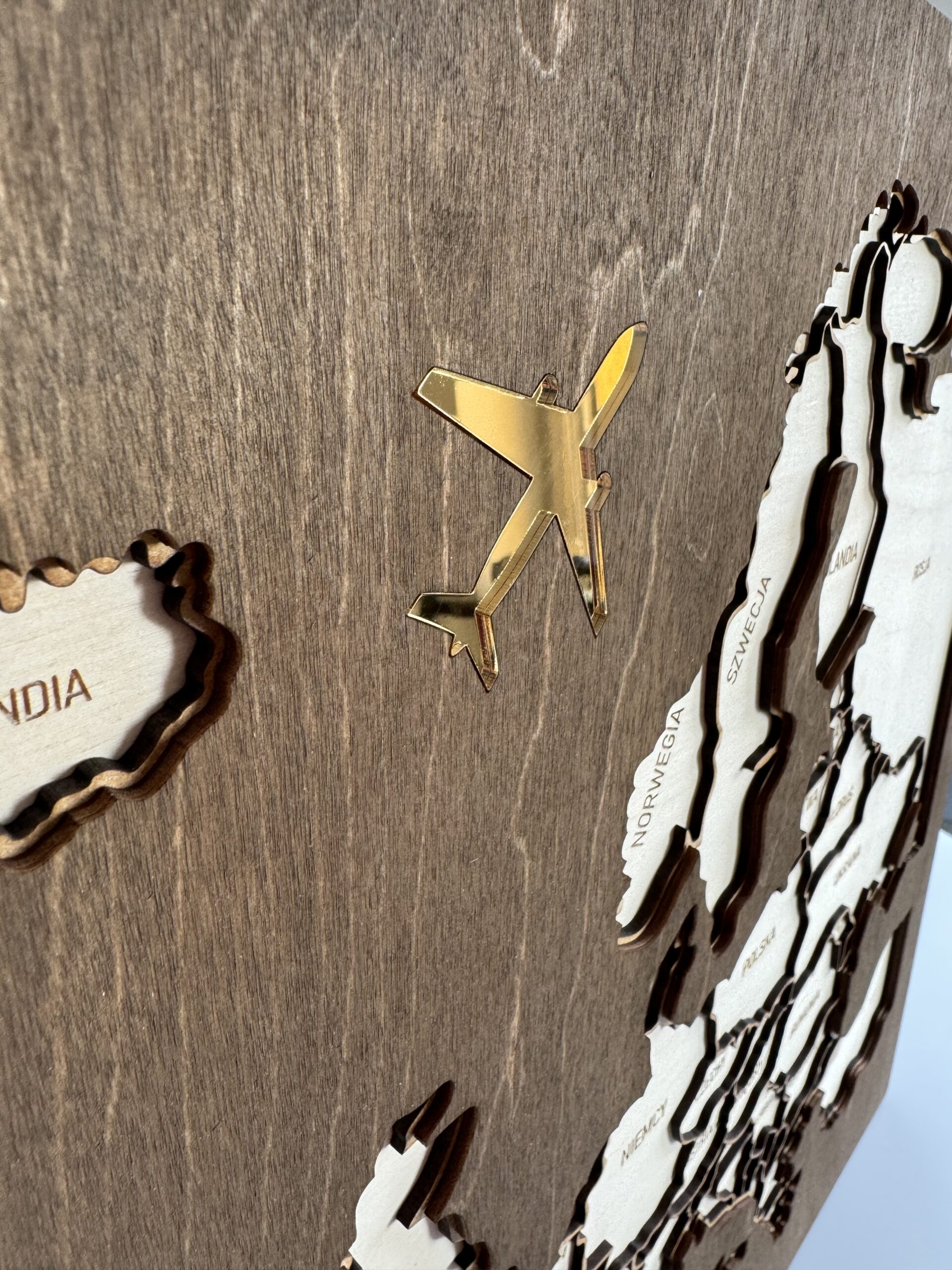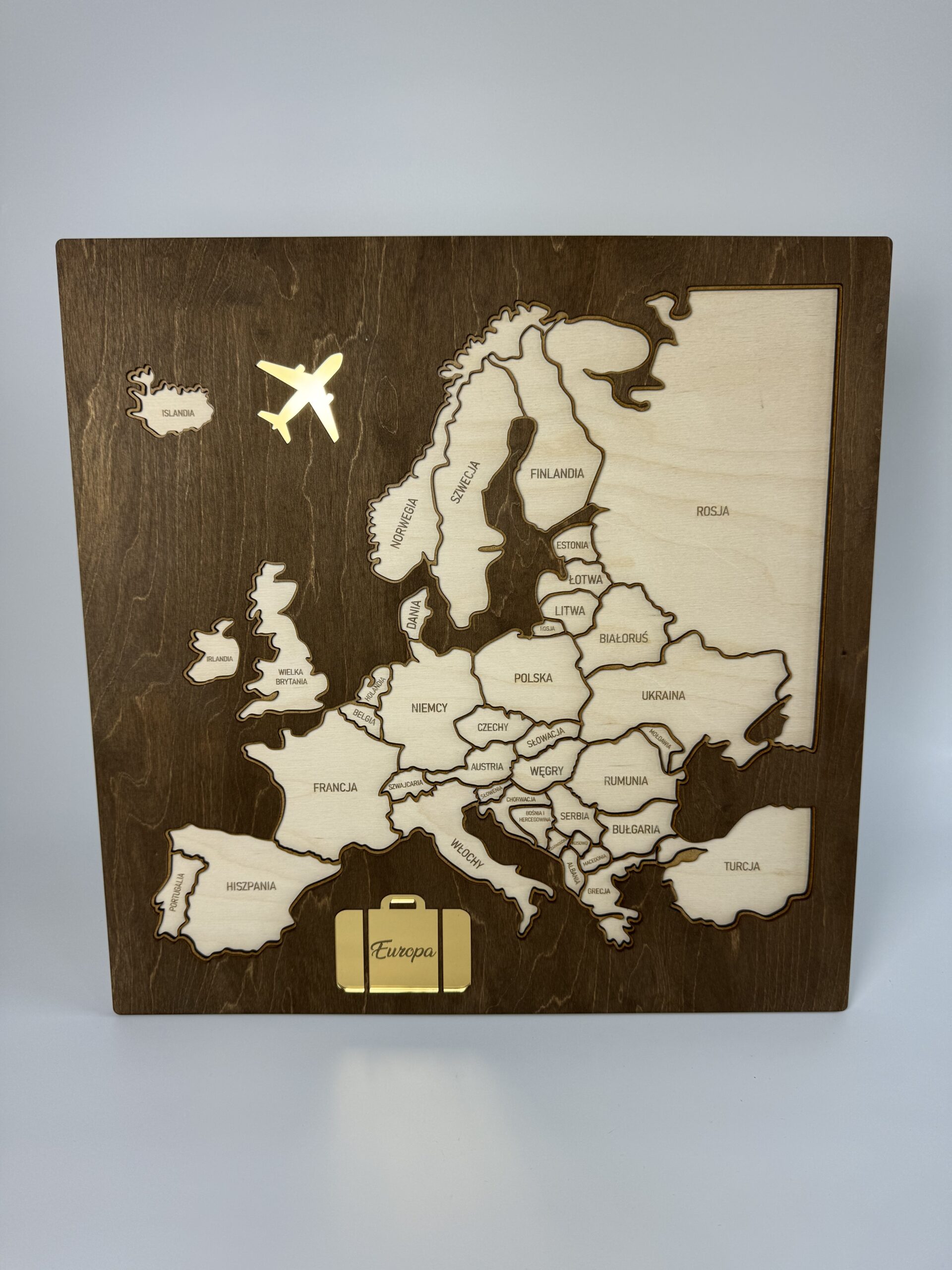 Posiada również dodatkowe elementy wykonane ze złotego lustra (samolot oraz walizka z napisem „Europa”)