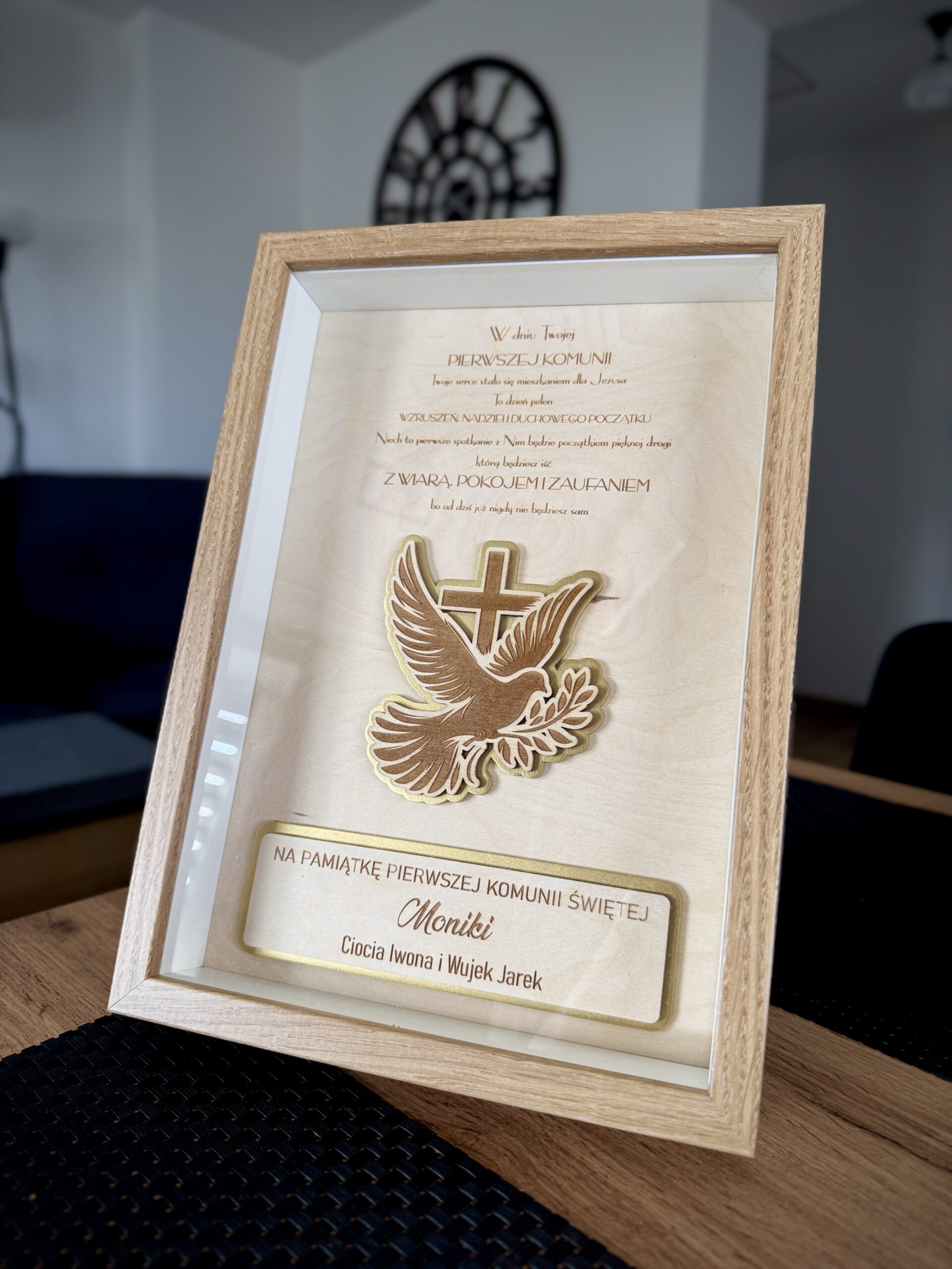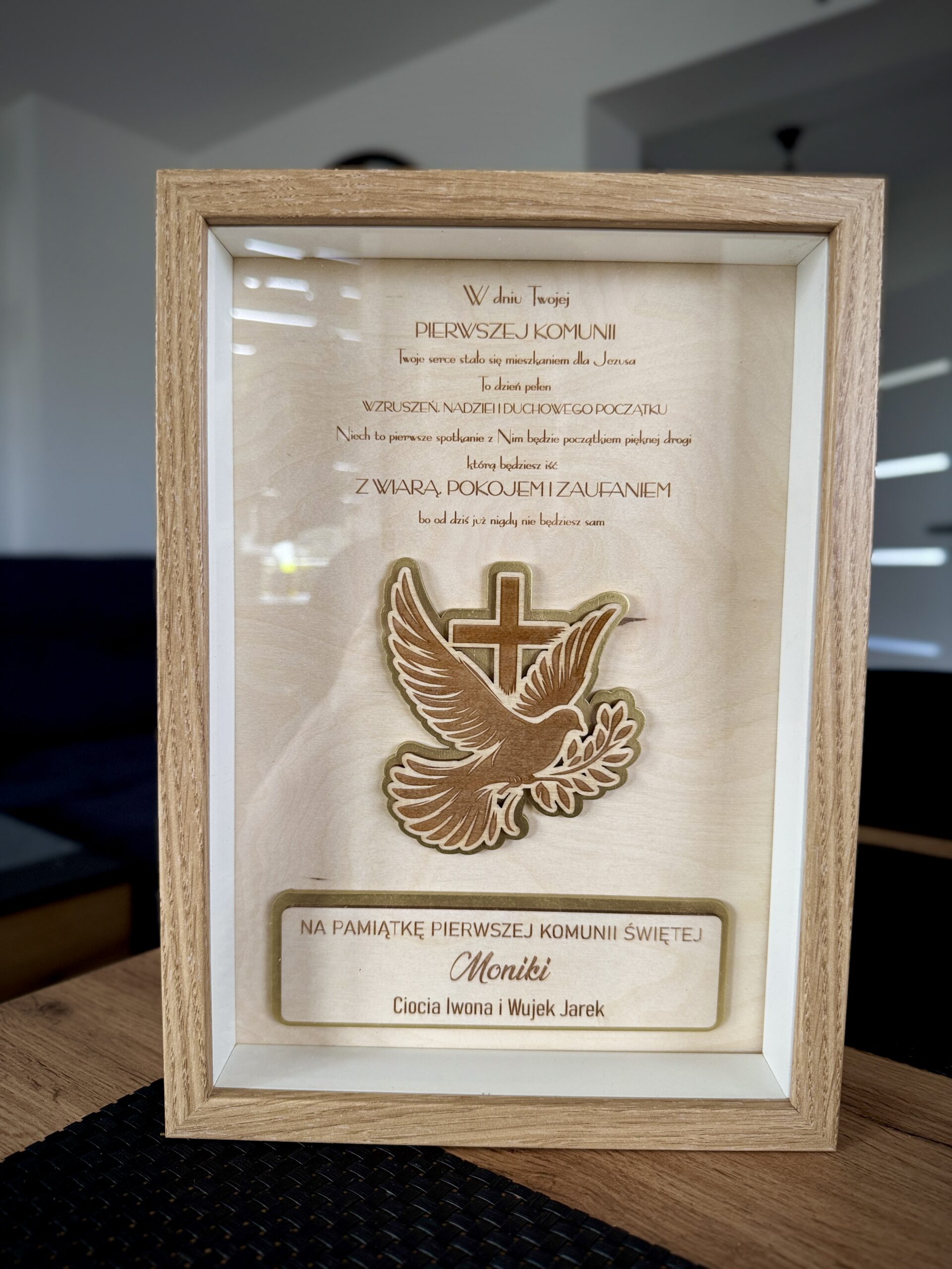Symboliczna i pełna duchowego znaczenia pamiątka komunijna z motywem gołębicy Ducha Świętego oraz krzyża. Idealny prezent, który pozostanie z dzieckiem na długie lata.