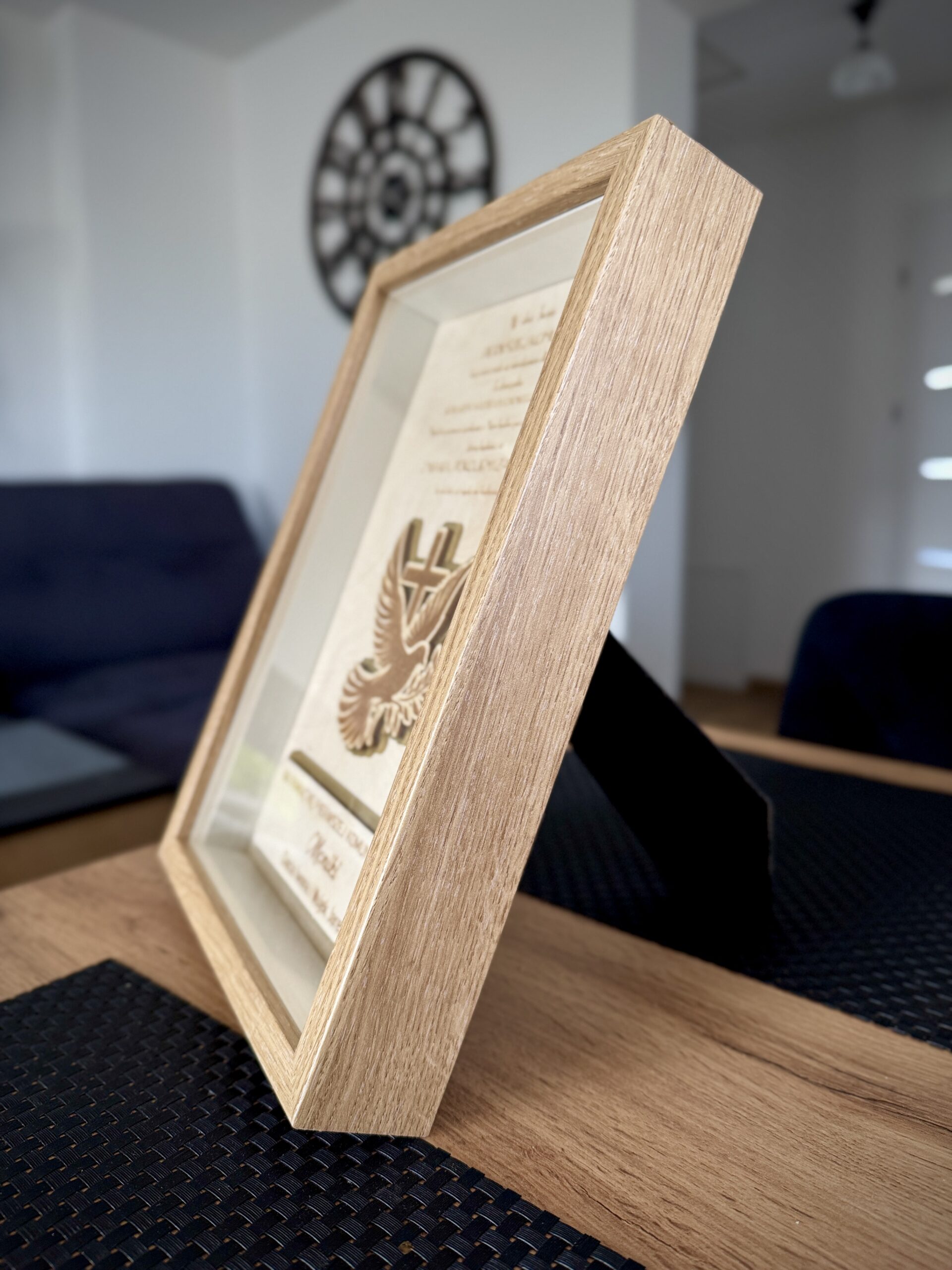 Dzięki zastosowaniu warstwowej sklejki oraz plexi, ramka tworzy efekt przestrzenności (shadow box), który przyciąga uwagę i podkreśla wyjątkowość produktu. Subtelne złote elementy dodają całości elegancji.