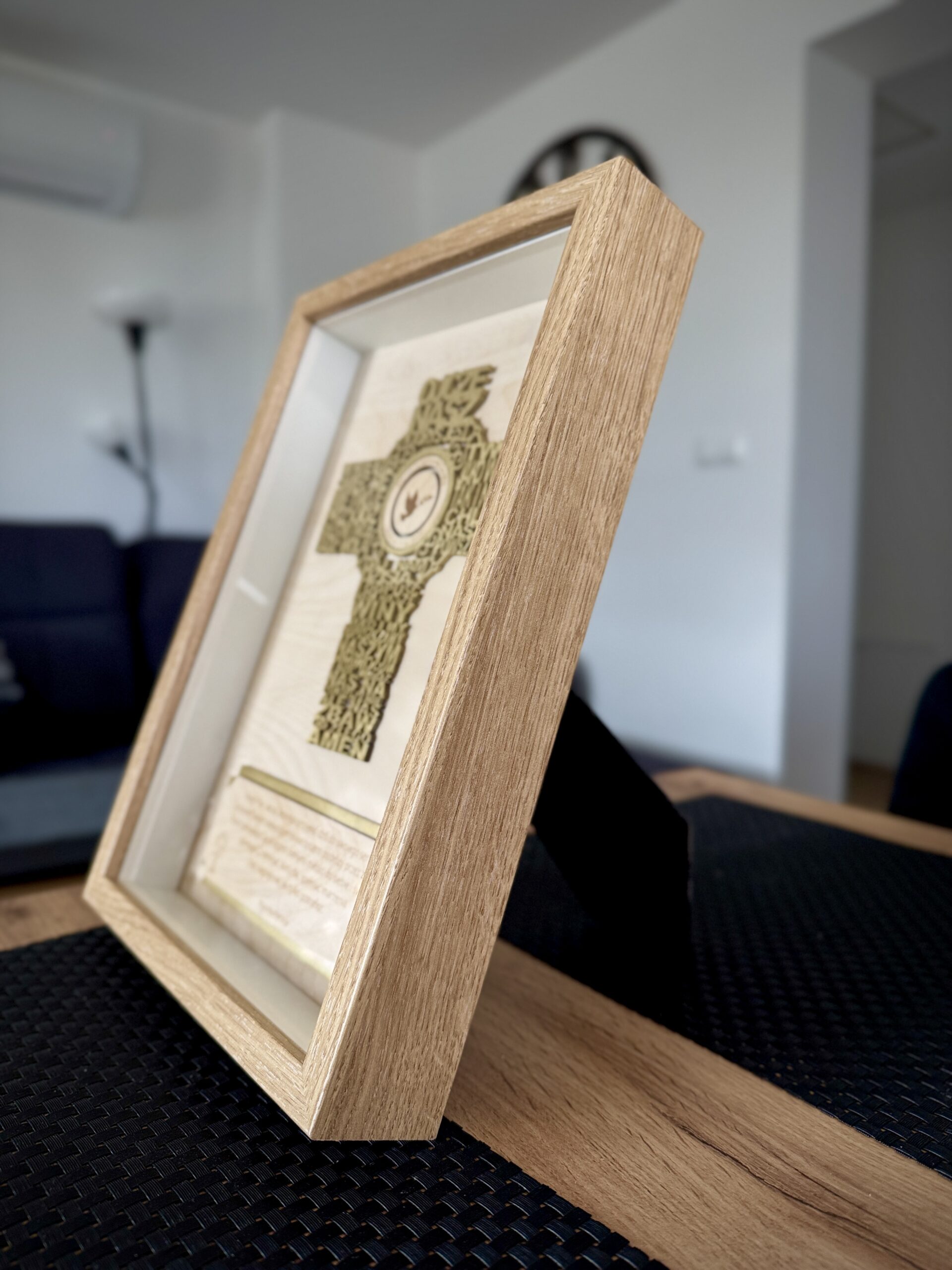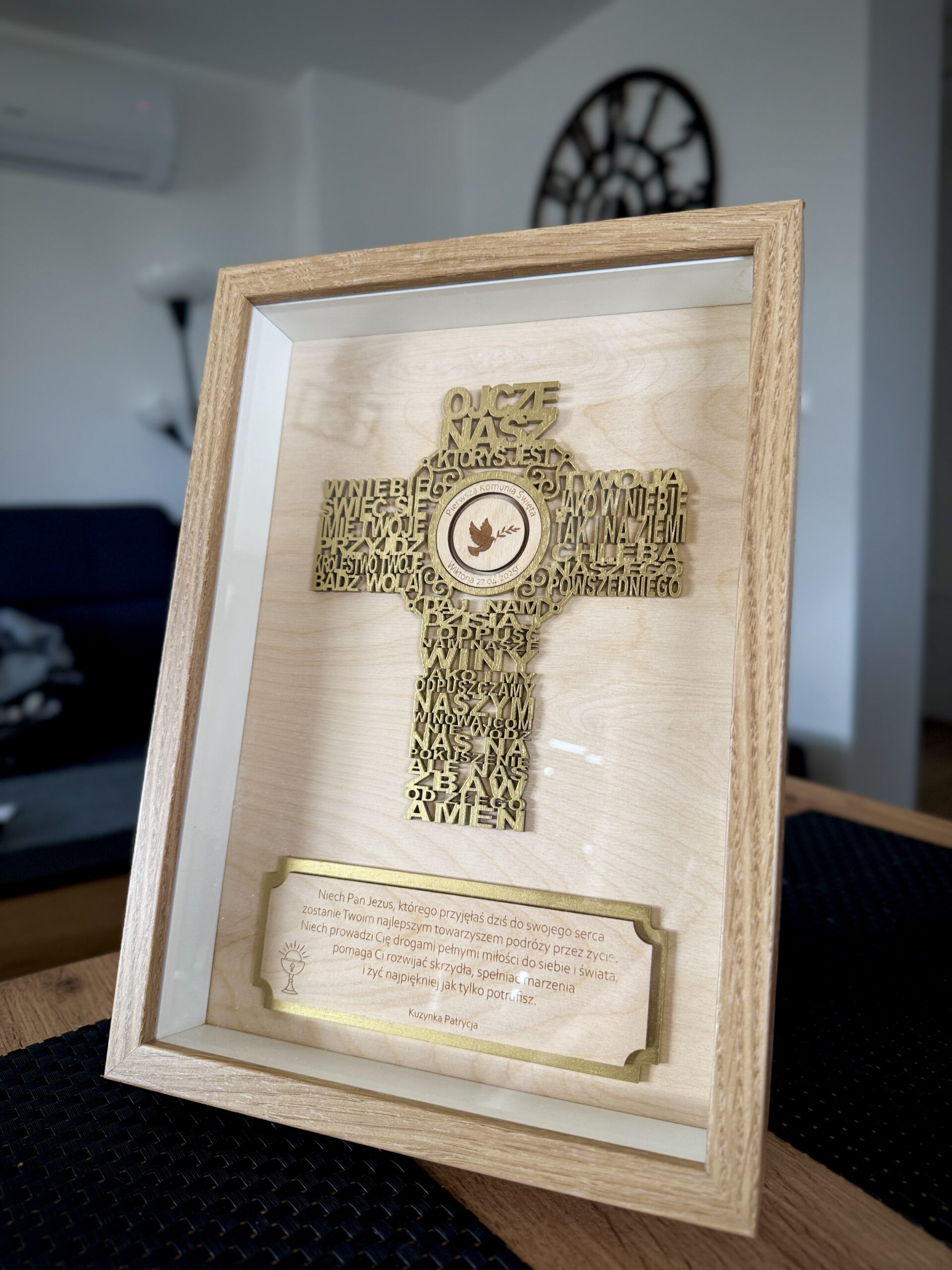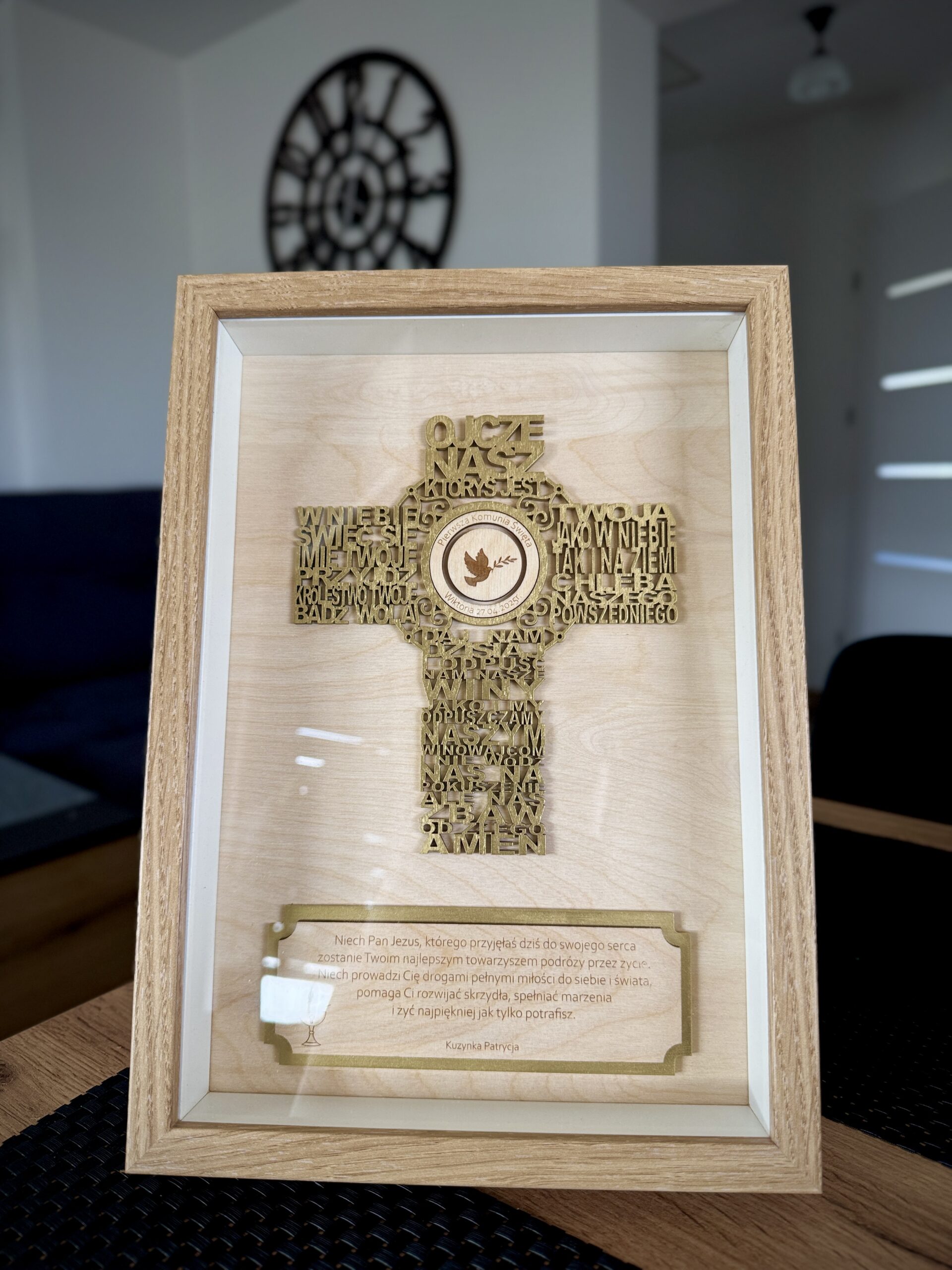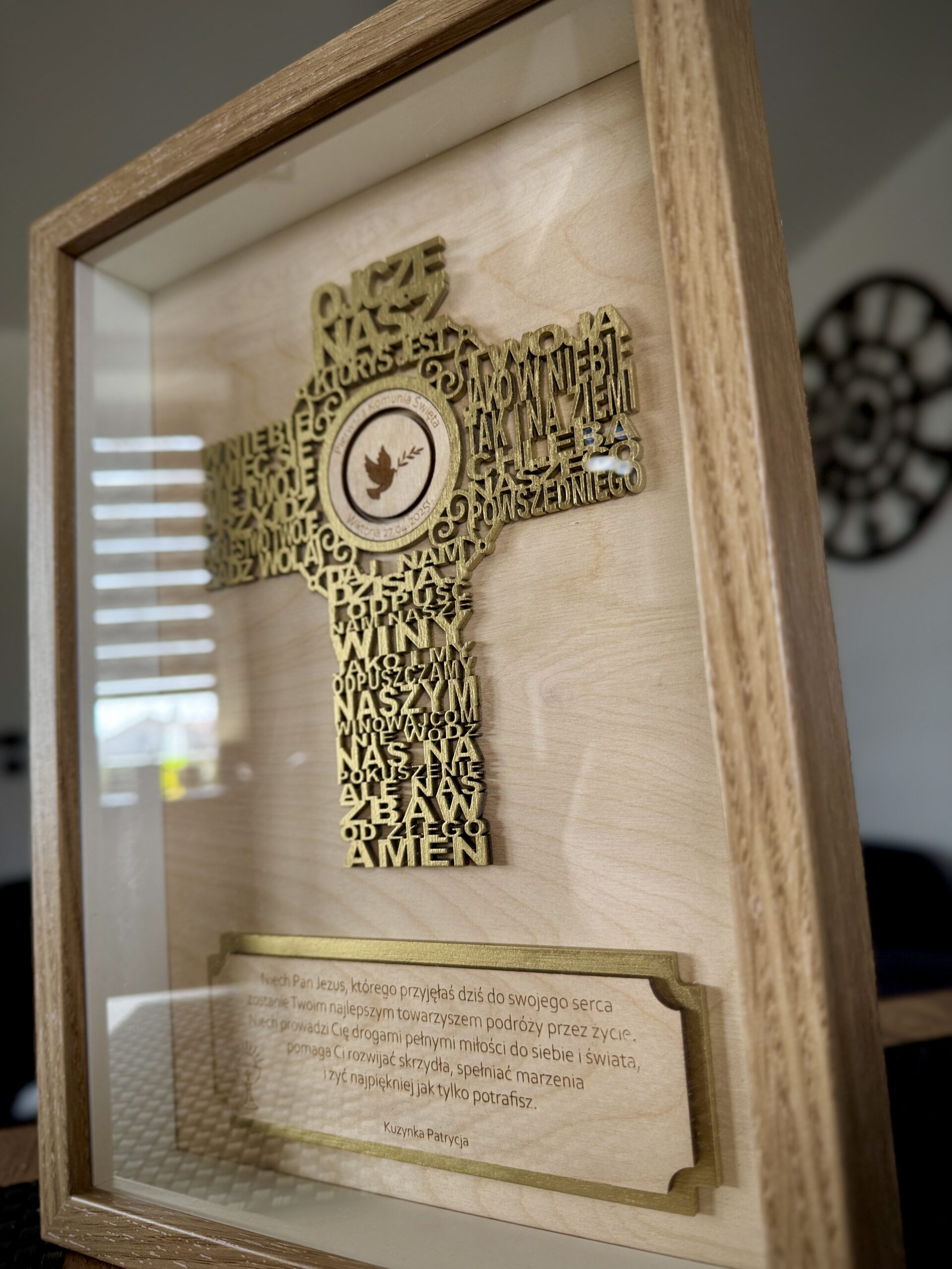 Unikalna pamiątka komunijna z krzyżem stworzonym z tekstu modlitwy „Ojcze Nasz”. To wyjątkowy projekt, który łączy symbolikę wiary z nowoczesnym designem.