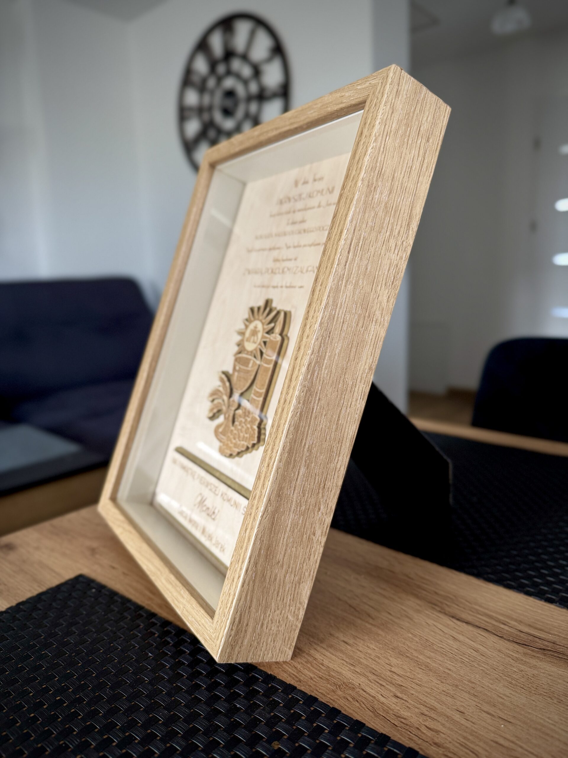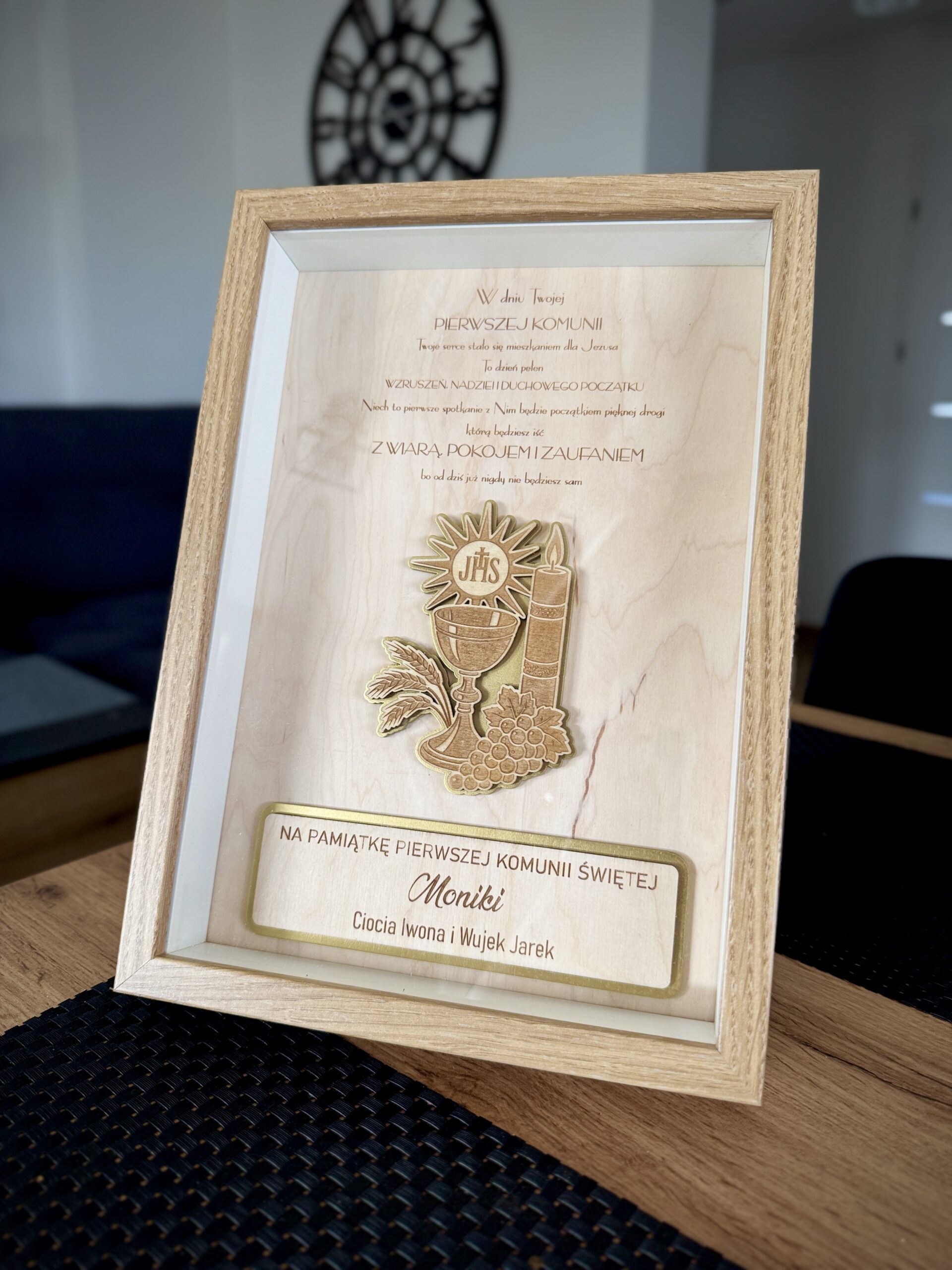 Ramka została wykonana z wysokiej jakości MDF oraz plexiglass, co nadaje jej nowoczesny, a zarazem ciepły charakter. Grawerowana sklejka 3 mm tworzy efekt głębi, a złote detale dodają całości subtelnej elegancji.