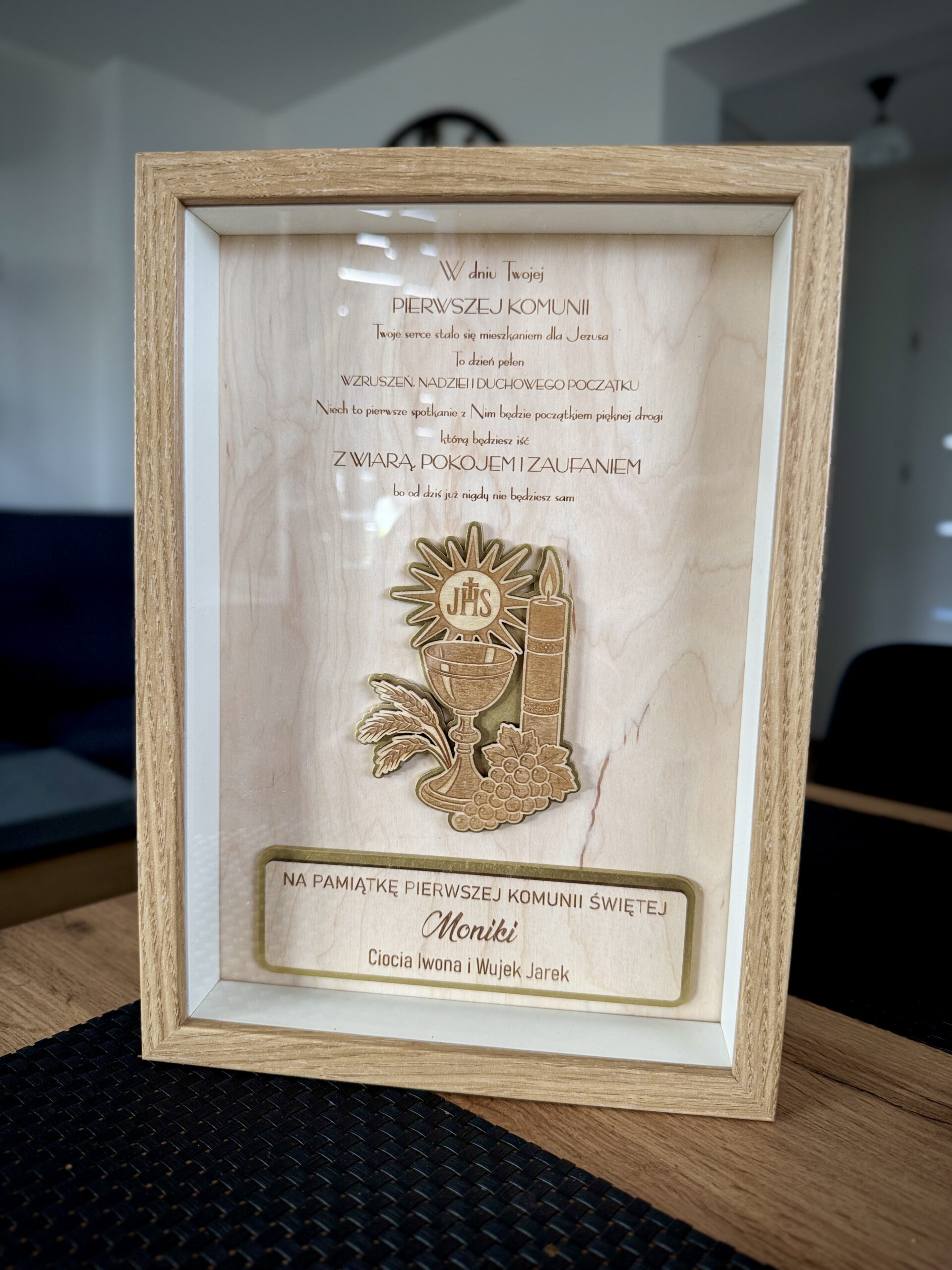 Elegancka i ponadczasowa pamiątka Pierwszej Komunii Świętej z motywem kielicha, hostii oraz symboli eucharystycznych. Ten wyjątkowy shadow box to piękny sposób na upamiętnienie jednego z najważniejszych dni w życiu dziecka.