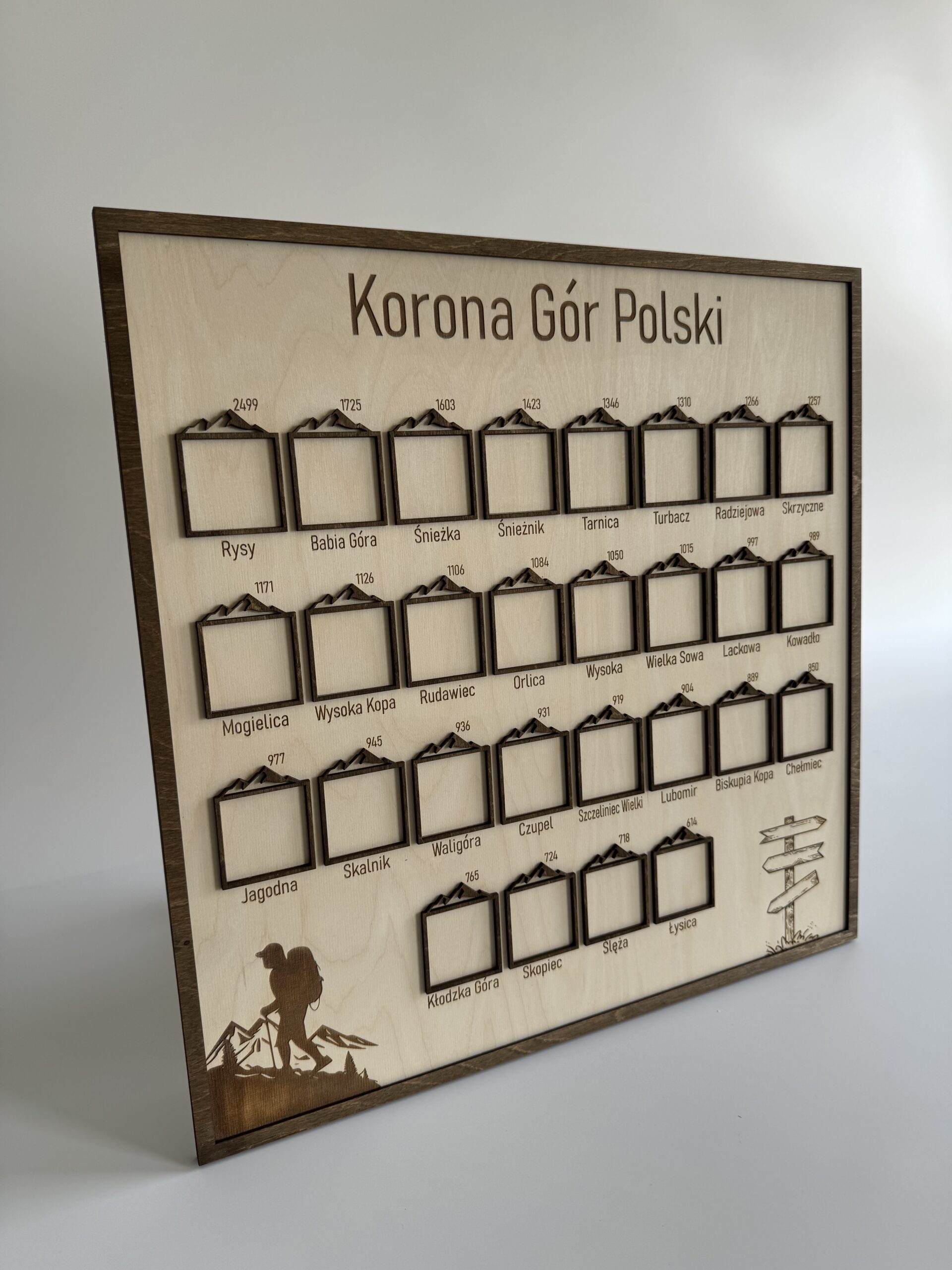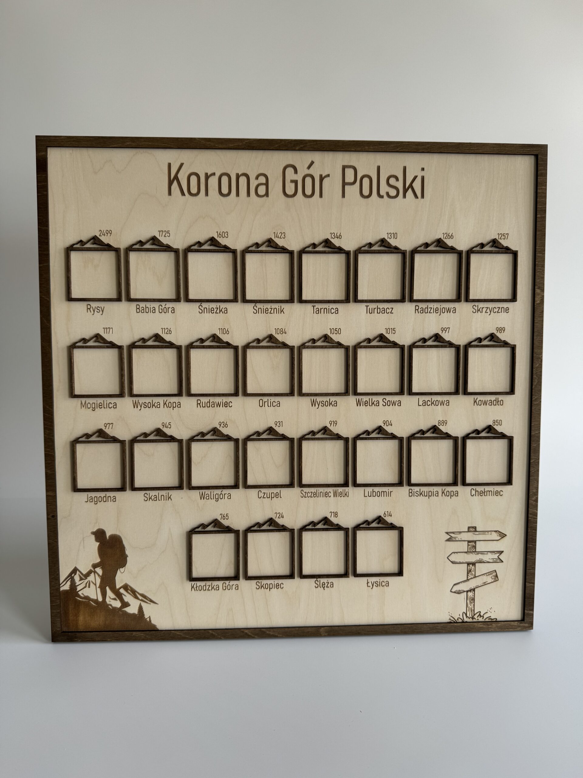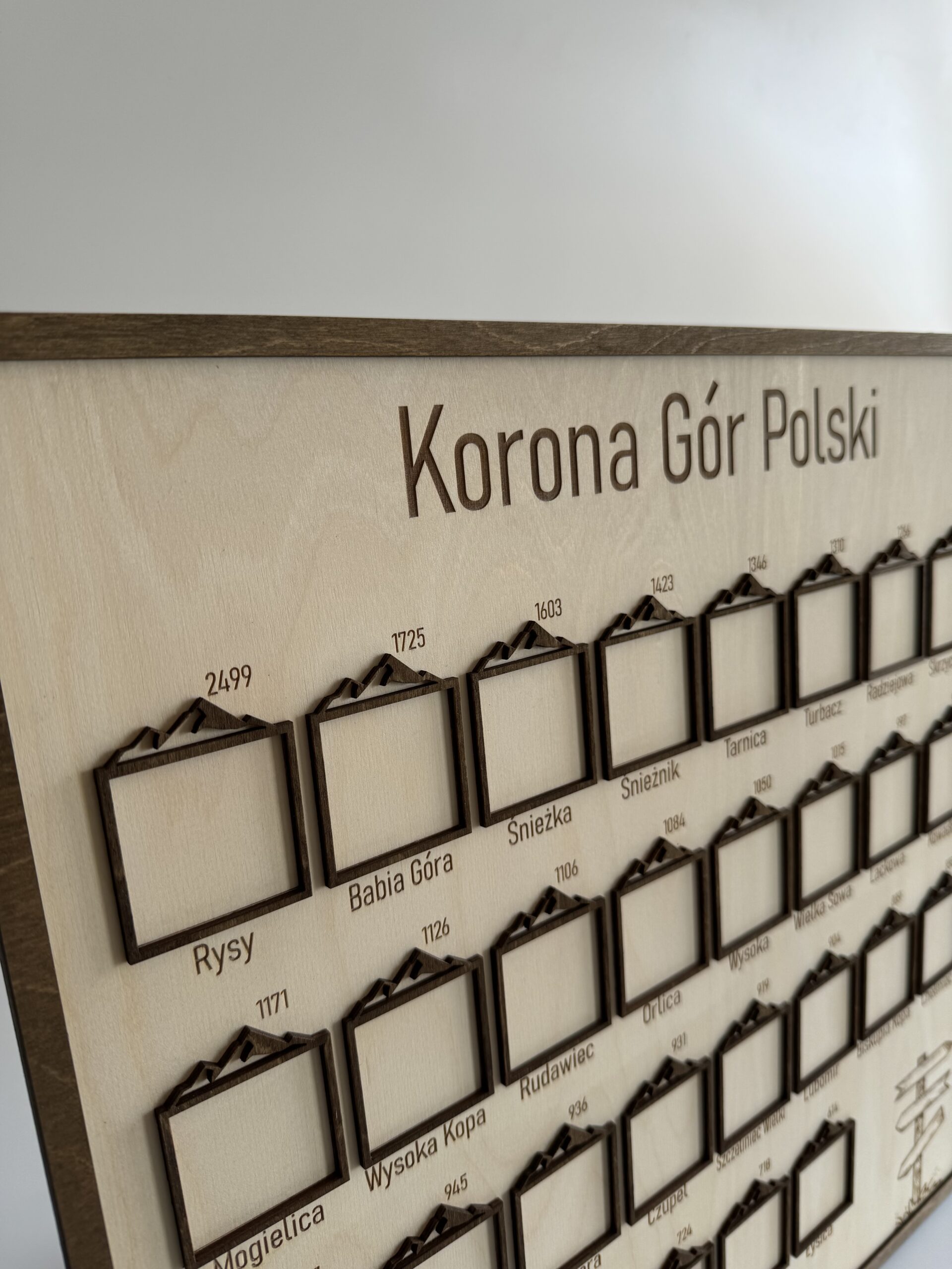 Ramka na zdjęcia zawiera listę 28 szczytów, które tworzą Koronę Gór Polski. Każdy z tych szczytów to wyjątkowe wyzwanie i niezapomniana przygoda dla każdego miłośnika górskich wędrówek.